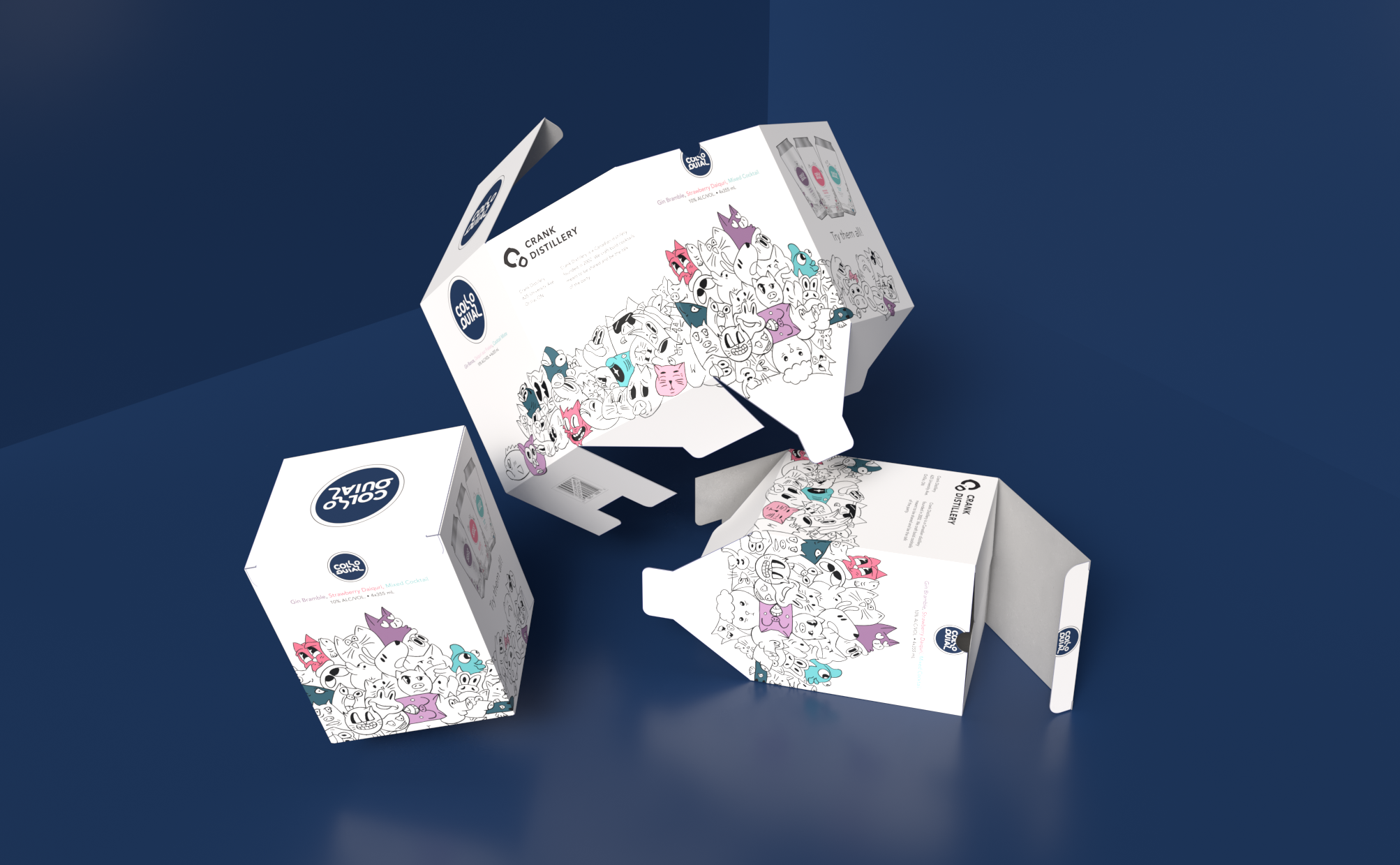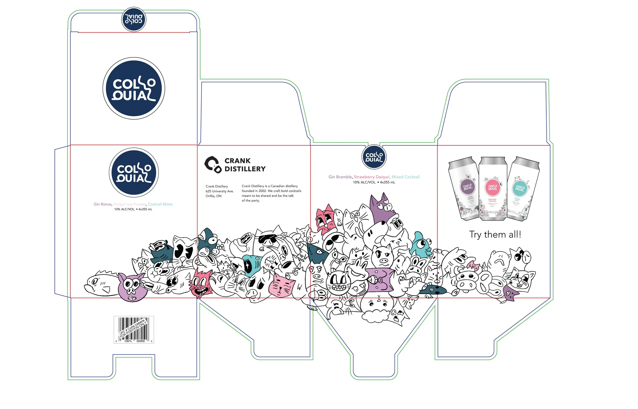 Colloquial is Crank Distillery’s ready-to-drink (RTD) lineup, meant to stand out on crowded LCBO shelves. Inspired by the idea of everyday, familiar language, each can visually references an English idiom, expressed through illustration rather than explicit wording. Each flavour uses a single pastel tone for a clean, modern look, while staying fully compliant with Ontario’s alcohol packaging regulations. The full series was released as a cohesive mixed pack. This project was my first foray into illustrated packaging, which taught me a great deal about researching and adapting classic illustration styles.