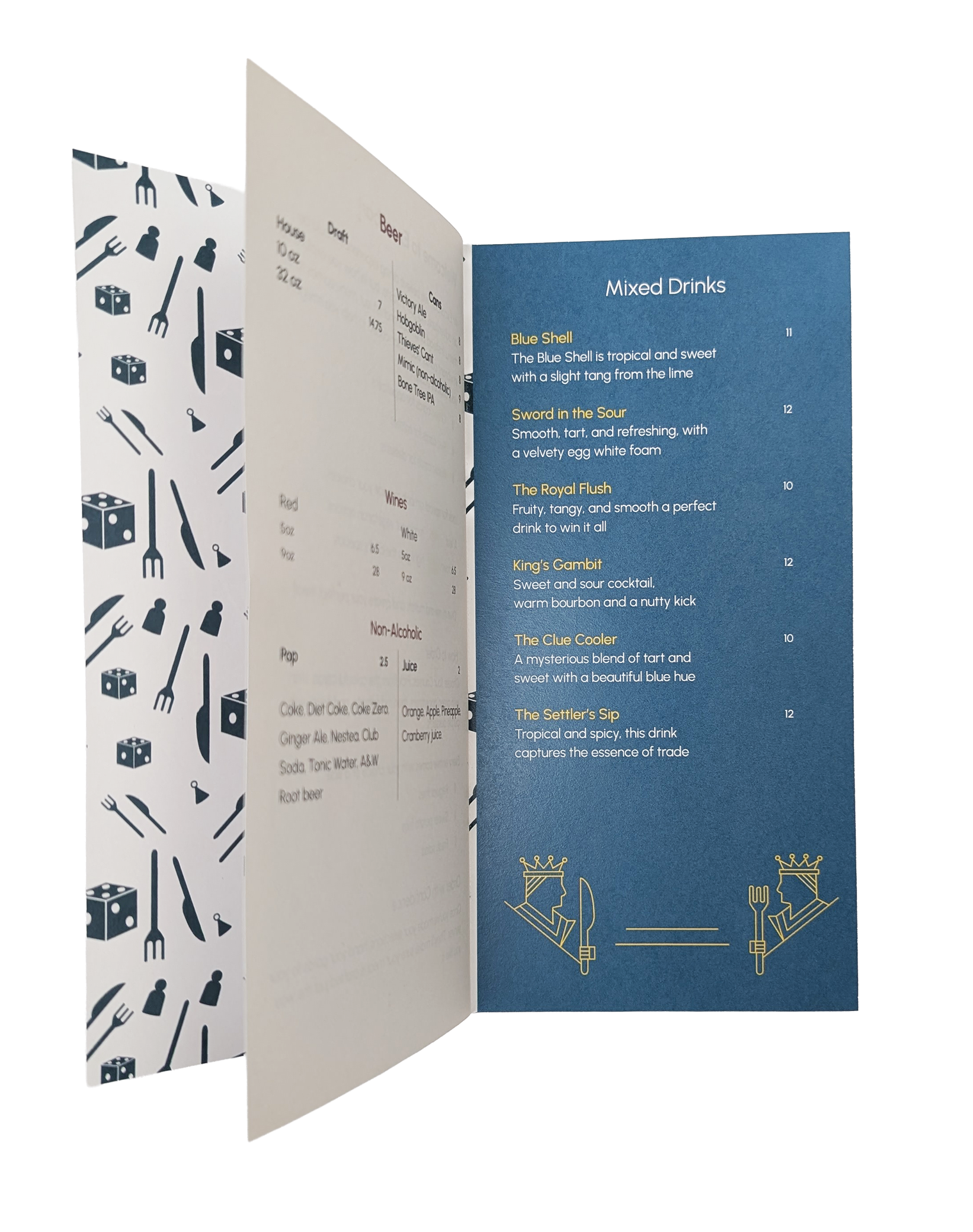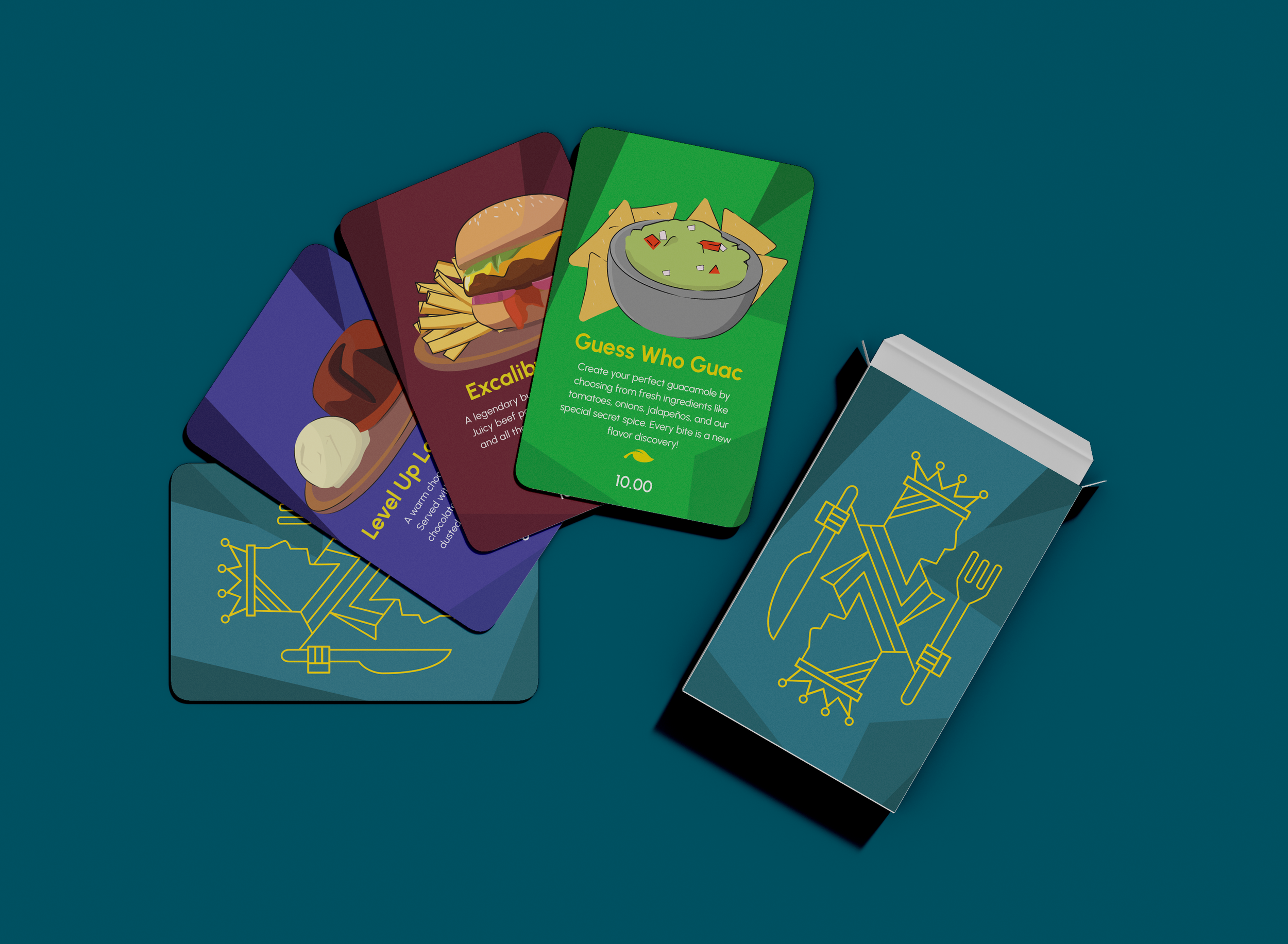 Excalibar had a more traditional menu, with three pages displaying all their drinks, appetizers, mains, and desserts. Inspired by their brand, I designed a card system for their kitchen delivery orders, along with a separate, simplified drink menu that can be kept on busy tables, since space is a commodity for their board‑game‑playing customers.