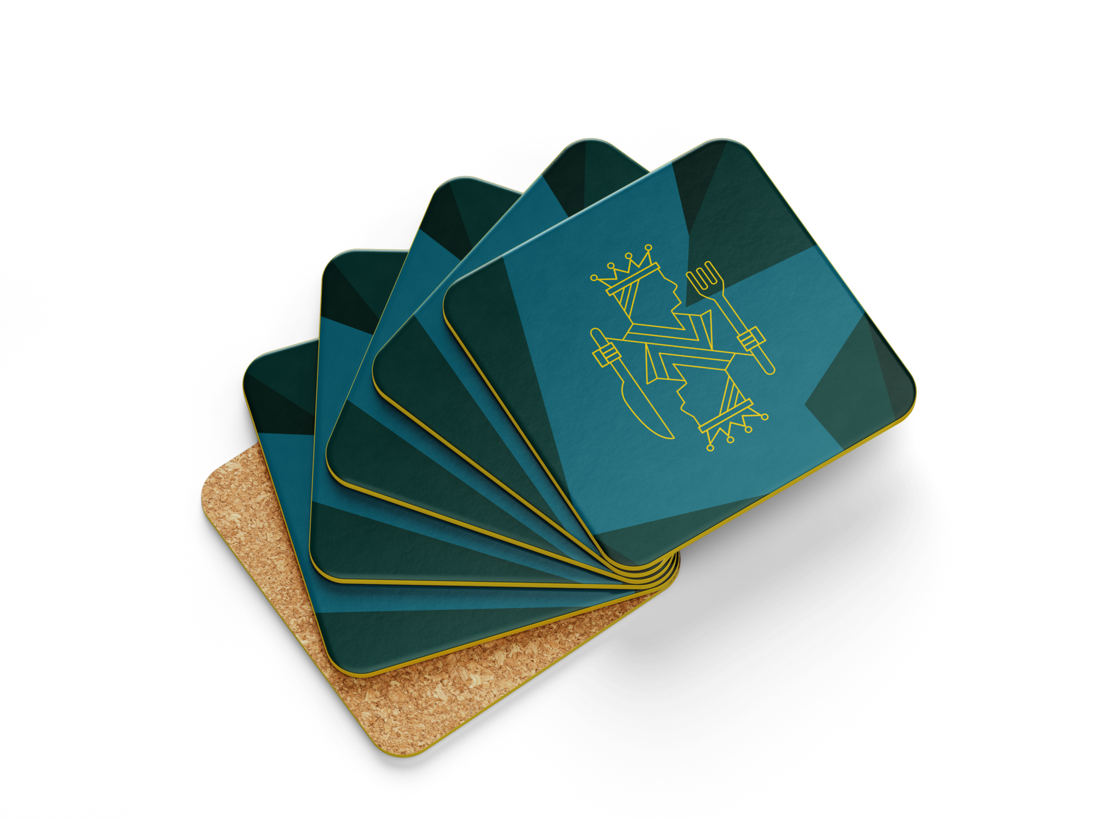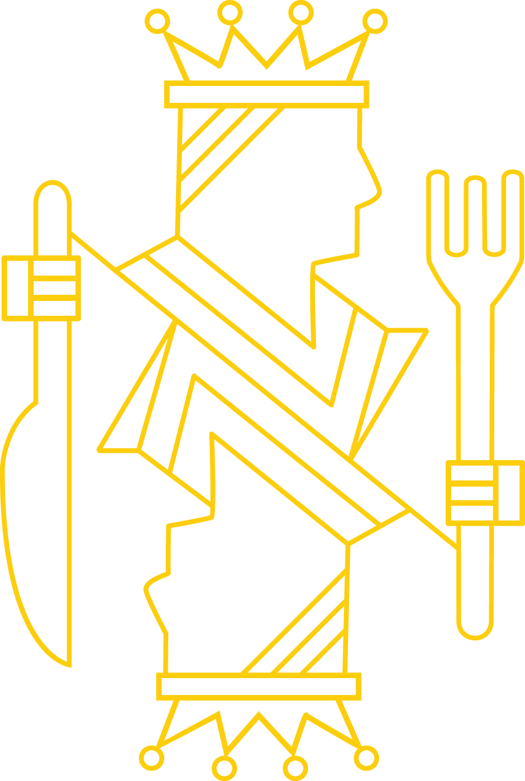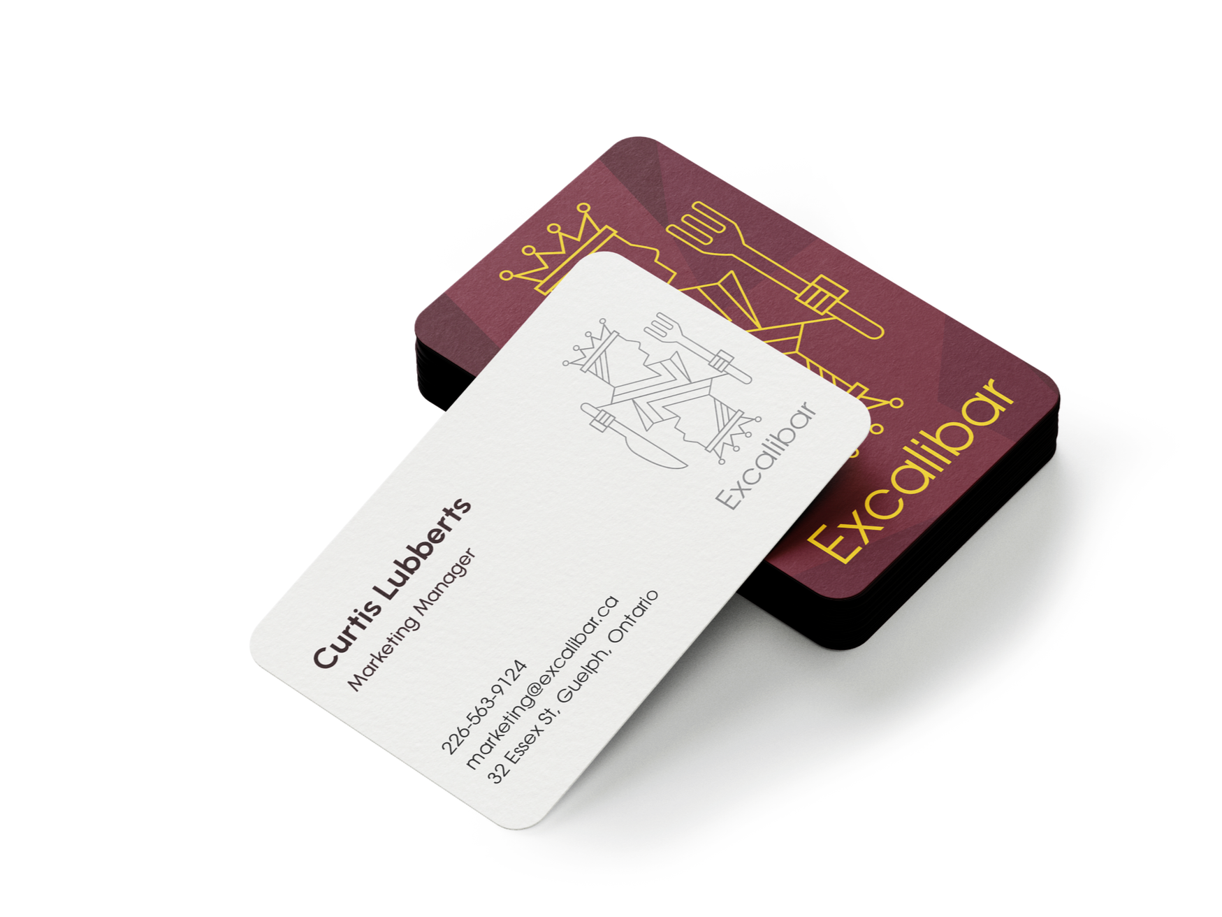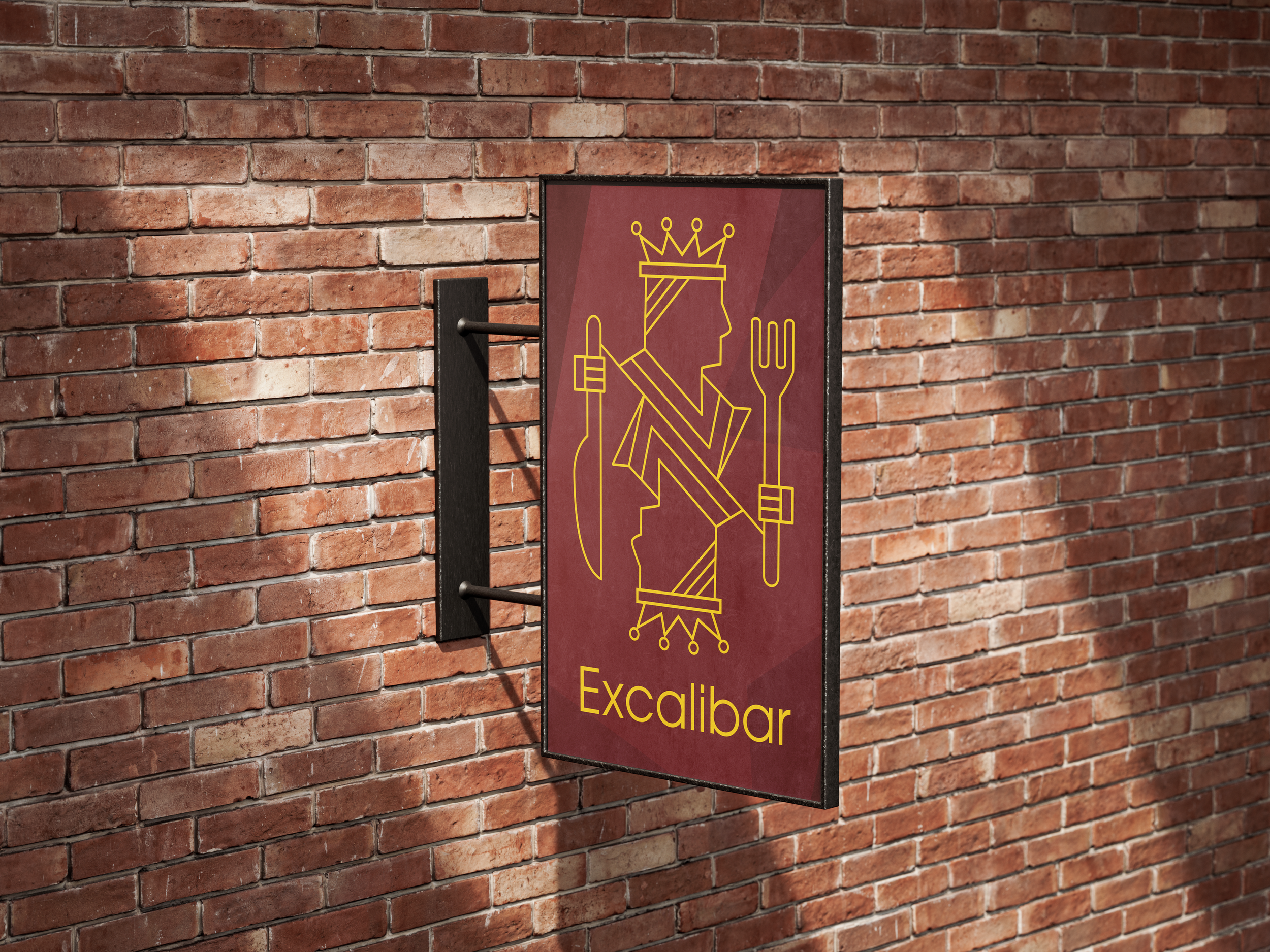 The Excalibar Logo is based off of the traditional playing card, combined with the two most commonly used eating utensils. This split design, featuring a two faced card and the utensils, balances the eating and the gaming aspects of the Excalibar. The icon itself is meant to keep a gender neutral, non-demographic specific look, because anyone can be royalty here. The worthy can pull the sword from the stone (or the cake…) and best their friends in board game combat.